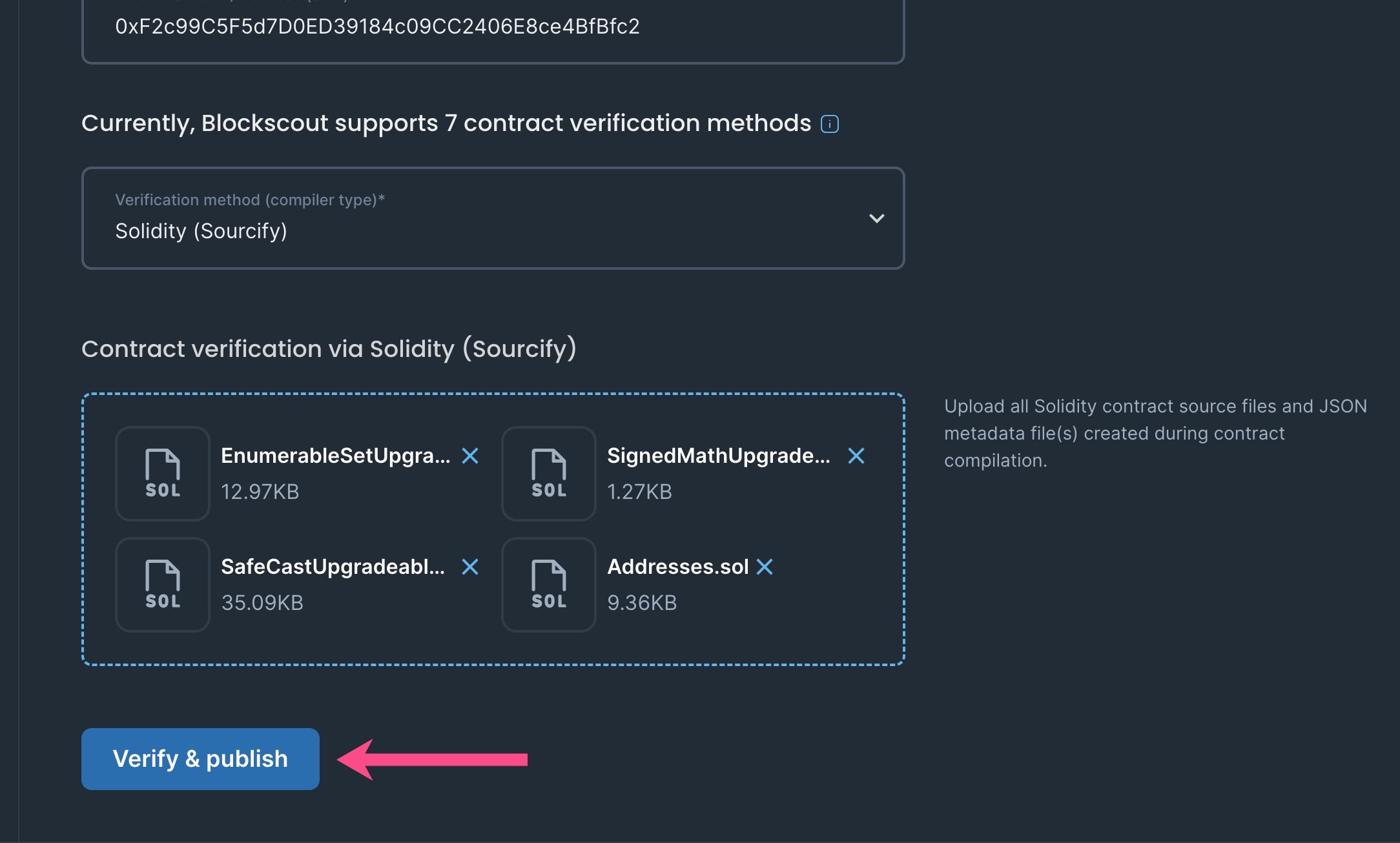 If your contract has linked libraries you should also drag & drop .json files _for those libraries. Once all files are added, start verification by clicking the _Verify & Publish button.