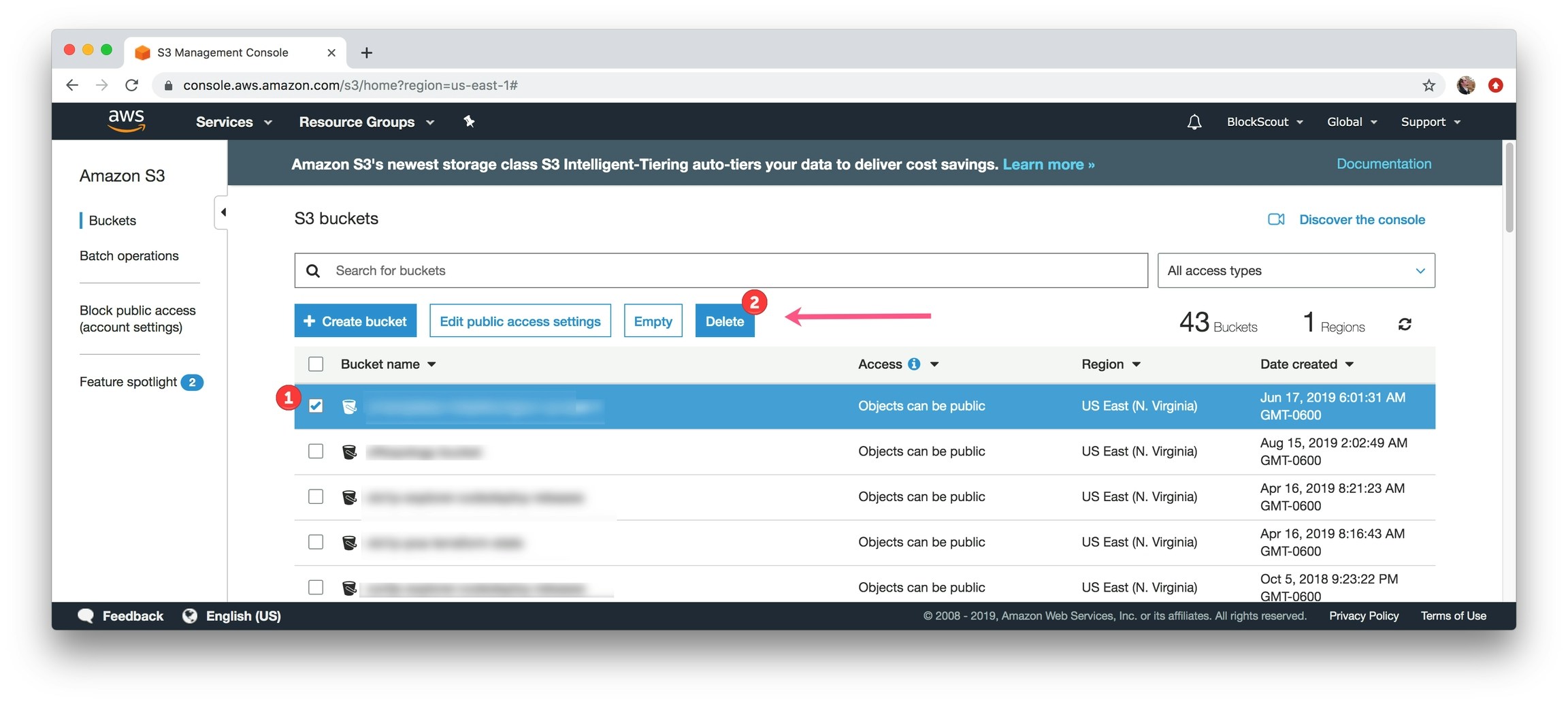 2) Find related buckets created by Terraform one by one. You can only delete one at a time. They all will be prefixed with ${prefix} from the Terraform config file. Select a bucket and click Delete button. Confirm the deletion. Continue for all related buckets.