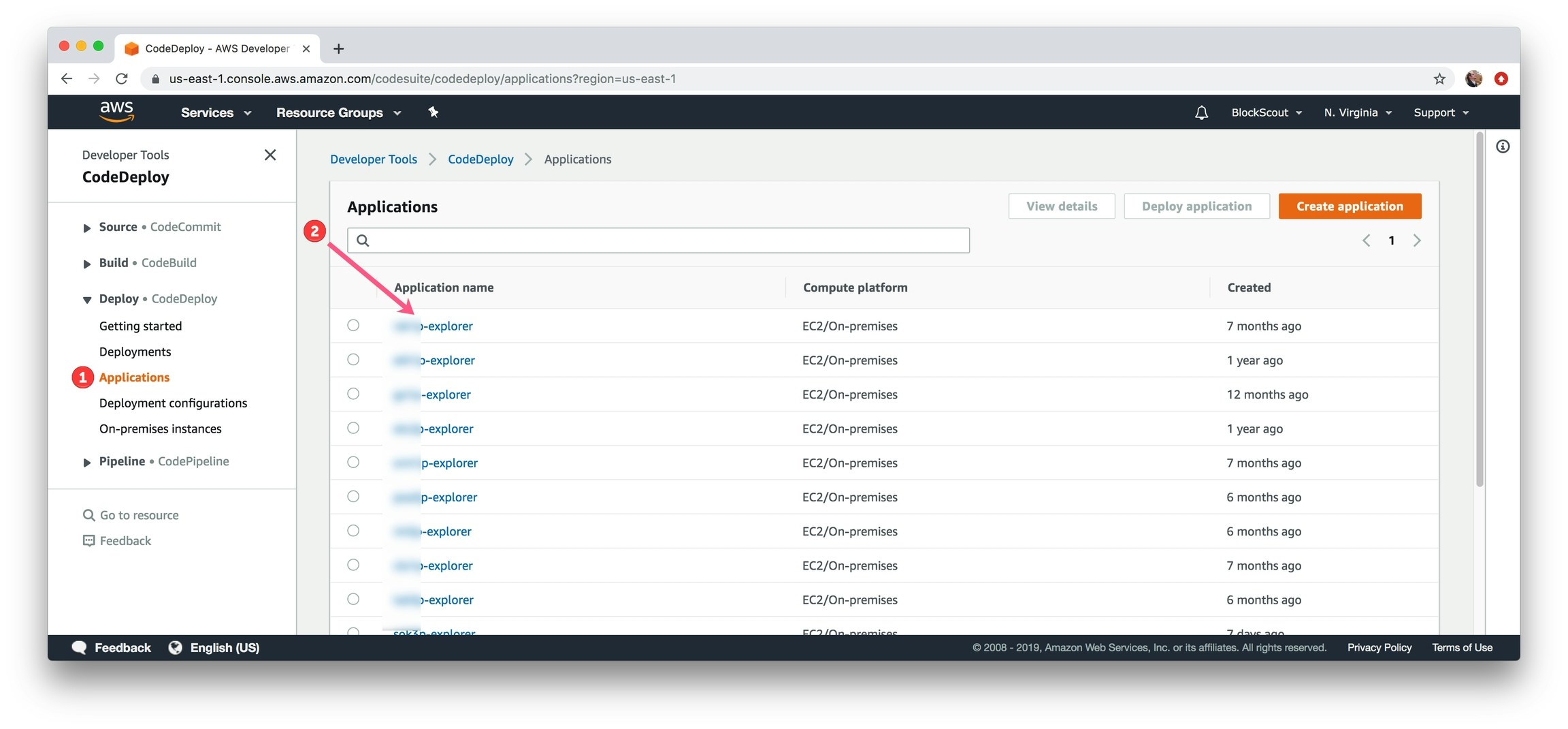 2) Select the Applications section in the left menu. Click an application in the list (related to Terraform deployment) to select.