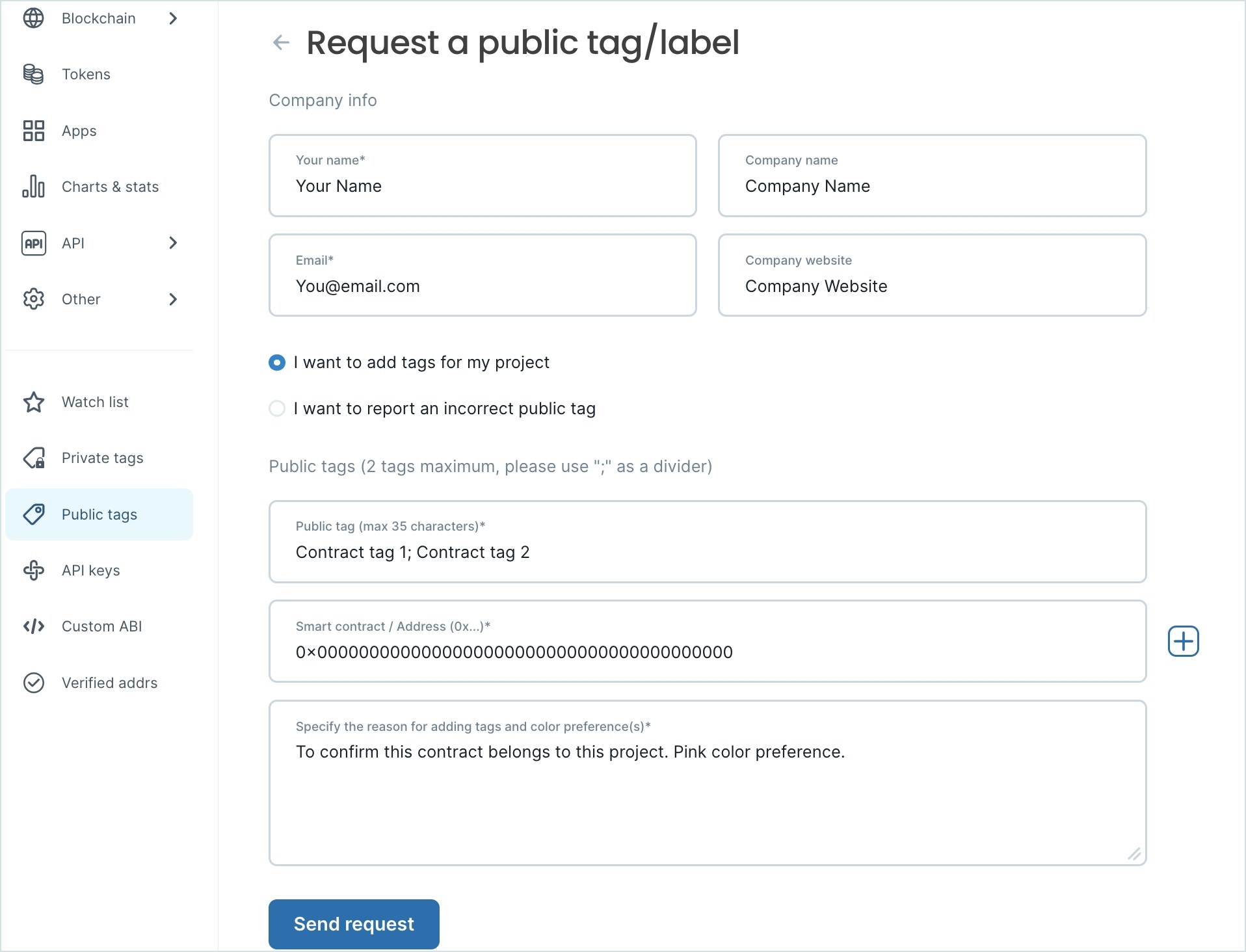 Fill out fields to request a public tag